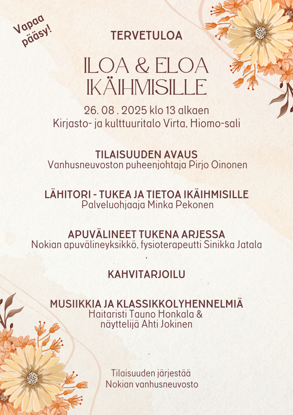 Tilaisuuden järjestää Nokian vanhusneuvosto. Ohjelmassa Lähitori: Tukea ja Tietoa ikäihmisille, palveluohjaaja Minka Pekonen, Apuvälineet tukena arjessa, fysioterapeutti Sinikka Jatala, musiikkia ja klassikkolyhennelmiä haitaristi Tauno Honkala ja näyttelijä Ahti Jokinen. Tilaisuudessa on kahvitarjoilu. Vapaa pääsy!